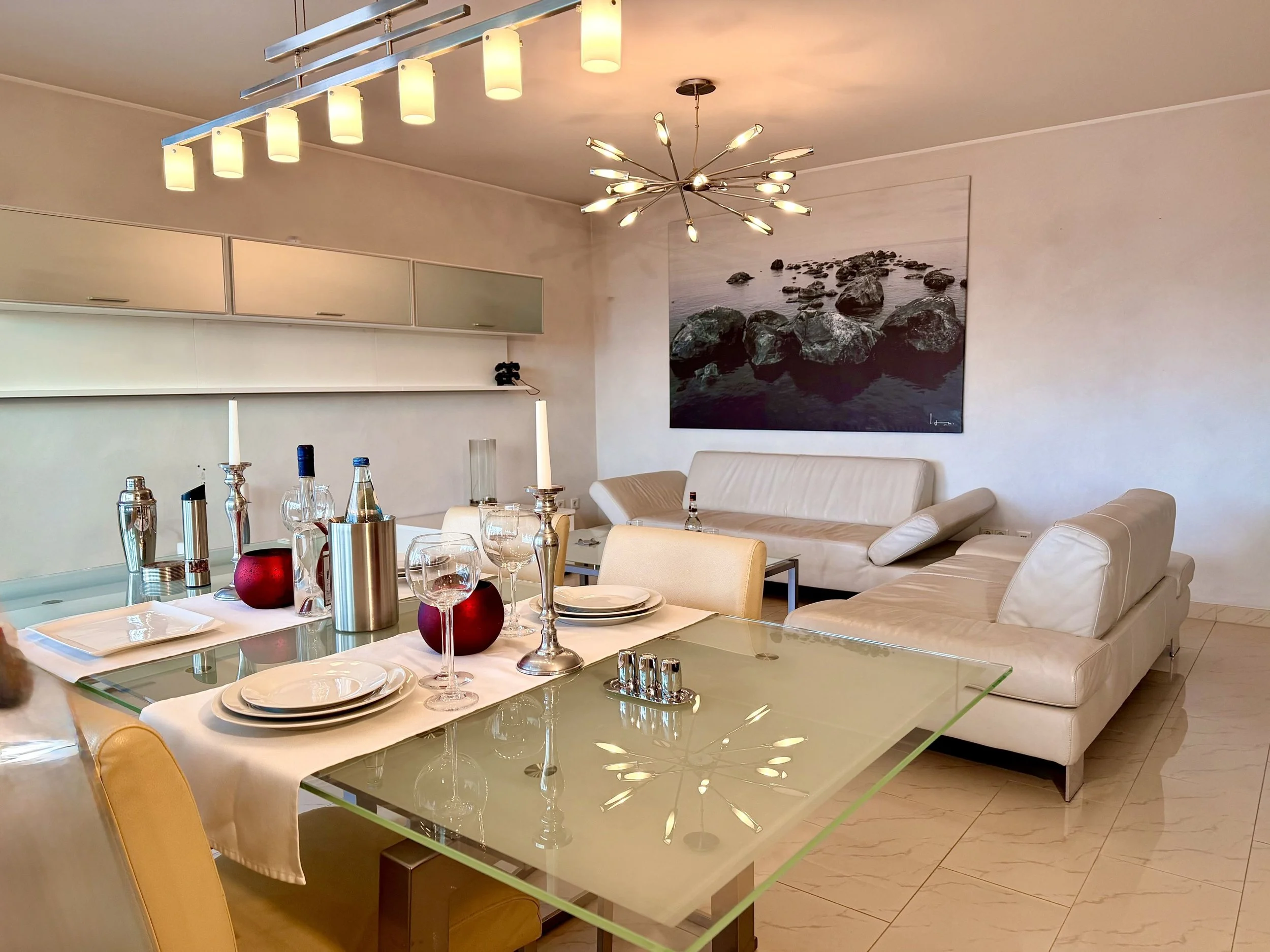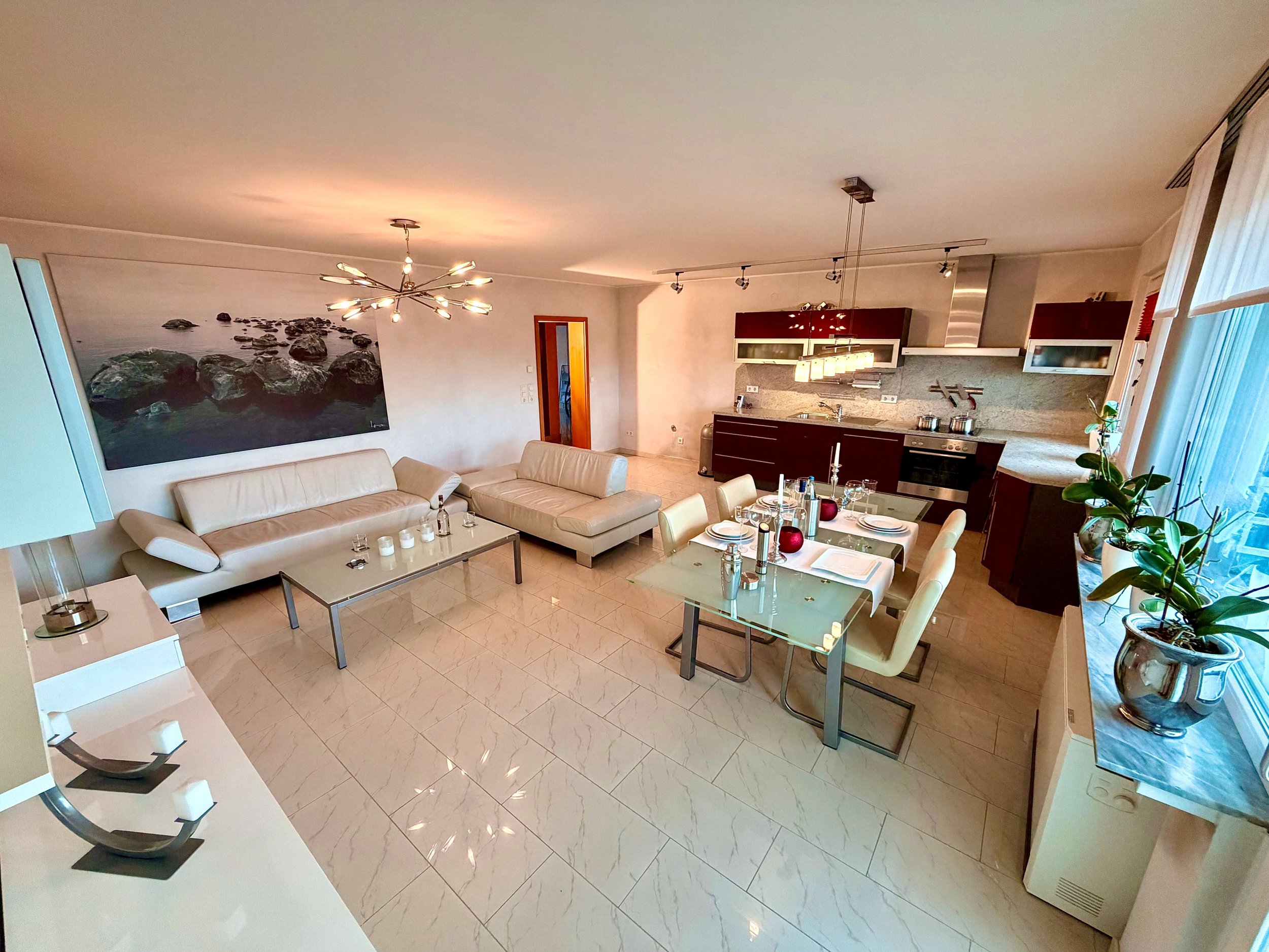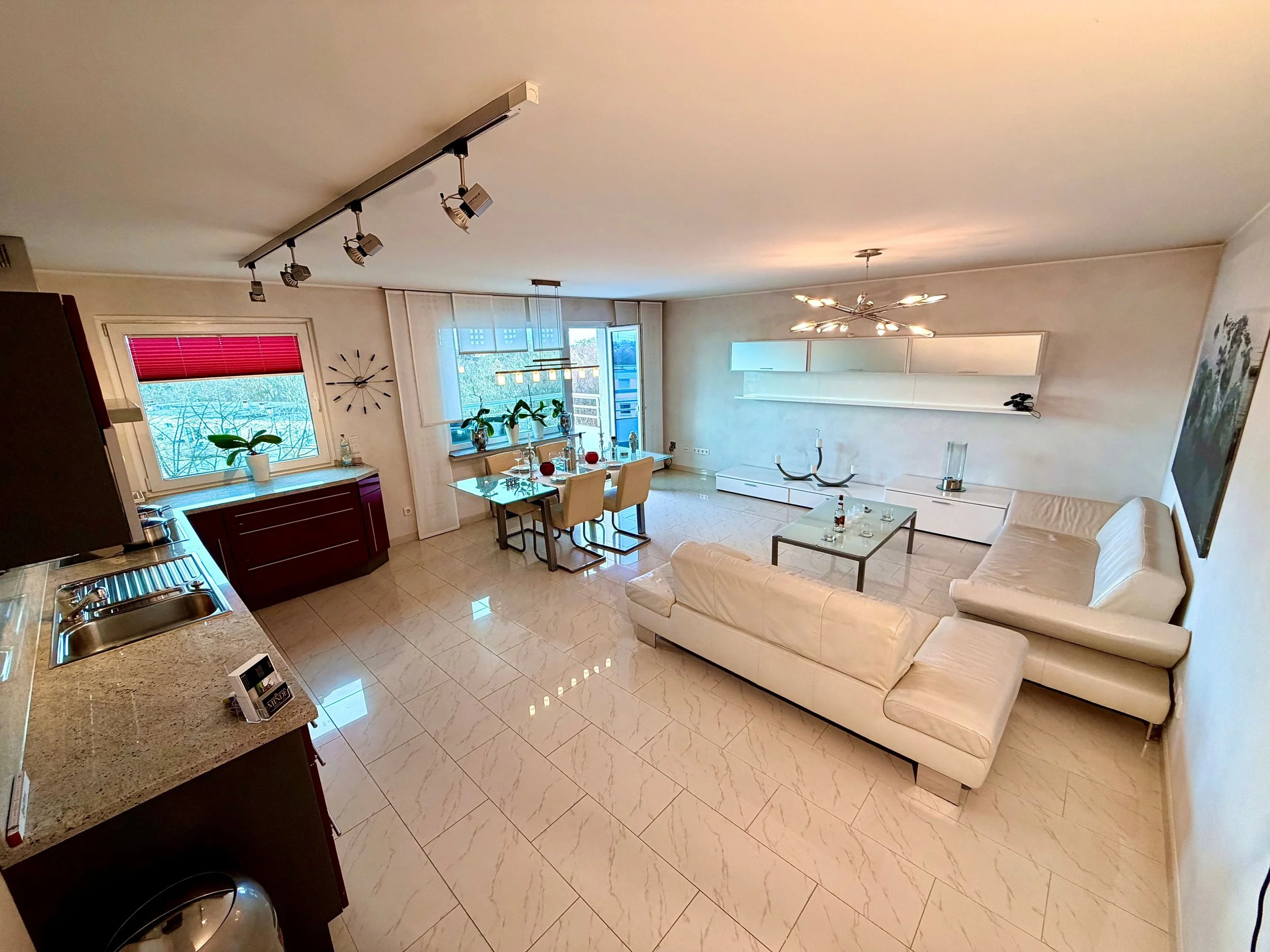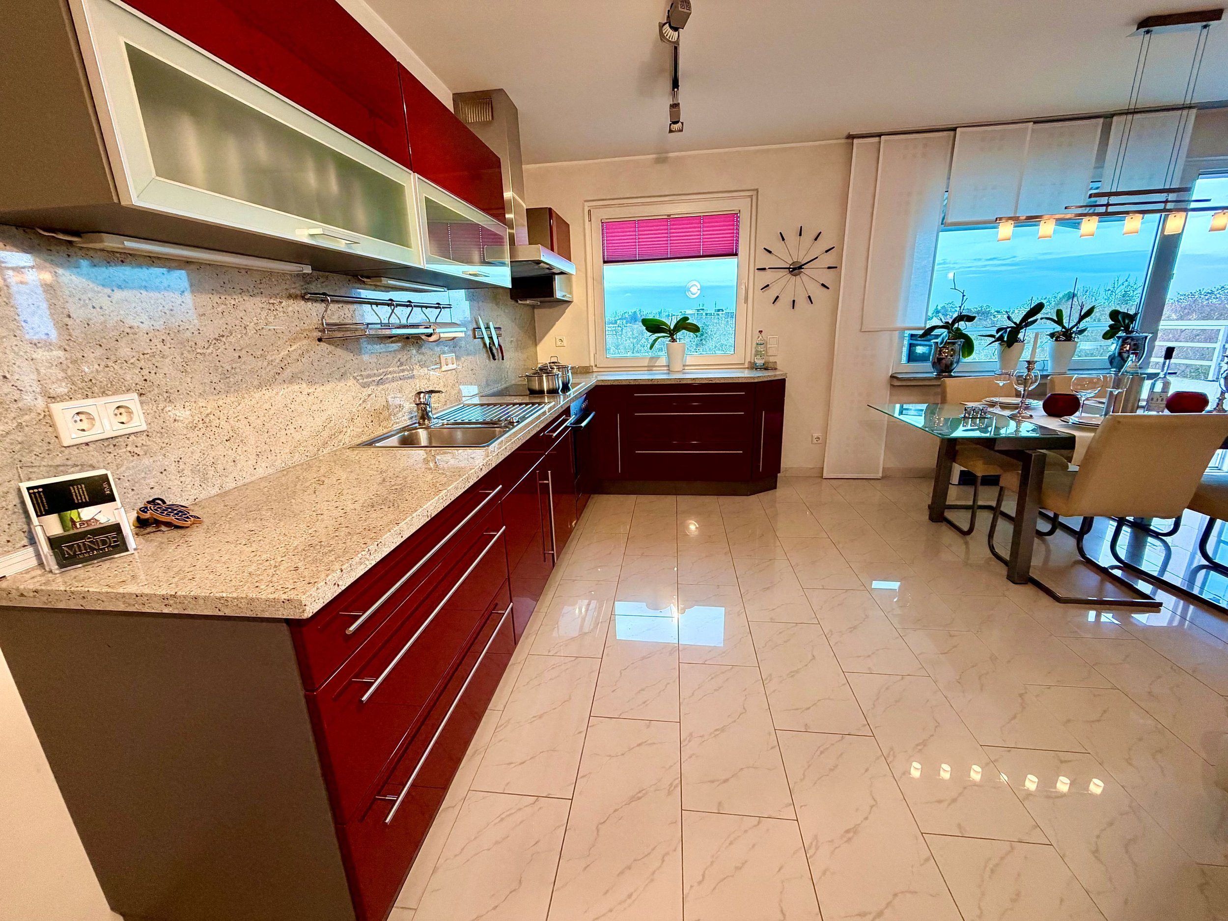 Herzstück ist der helle, offen gestaltete Wohn- und Essbereich mit großzügigen Fensterflächen. Die Küche bietet Zugang zum sonnigen Nord-West-Balkon mit Blick ins Grüne und ist mit einer hochwertigen rubinroten Astro-Einbauküche samt Siemens- und Bosch-Geräten ausgestattet.
