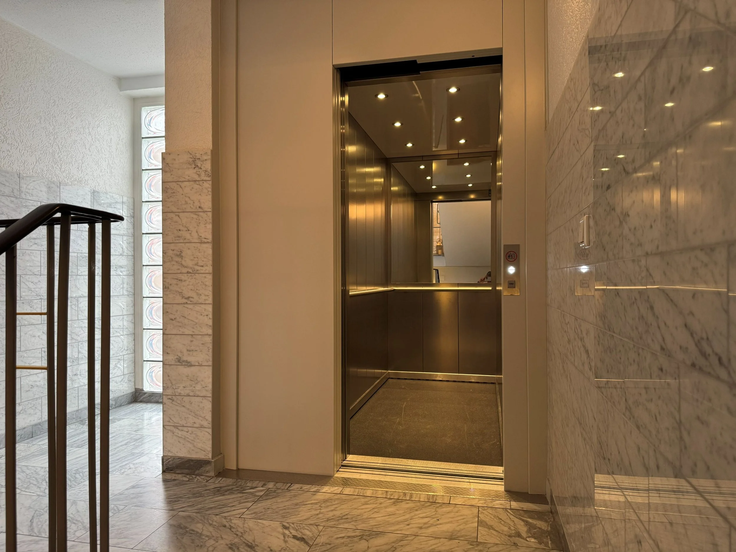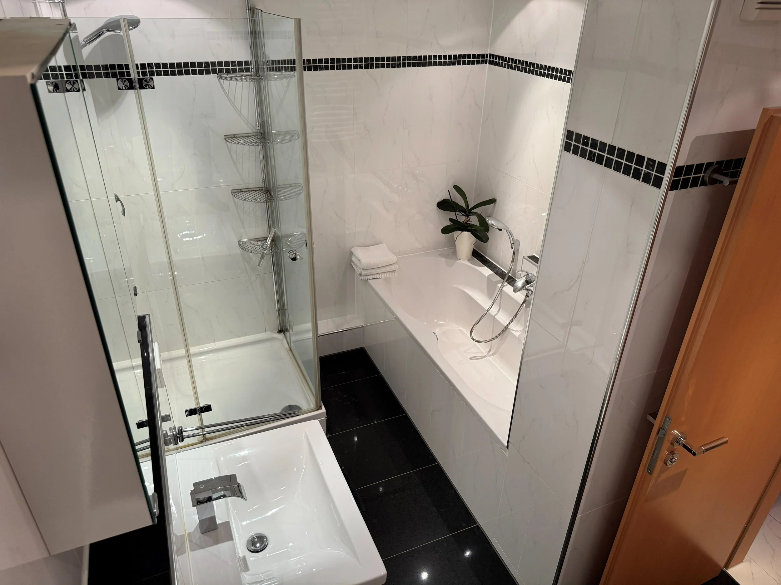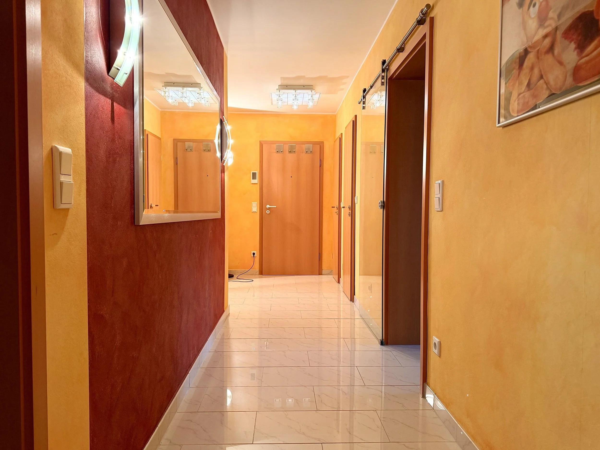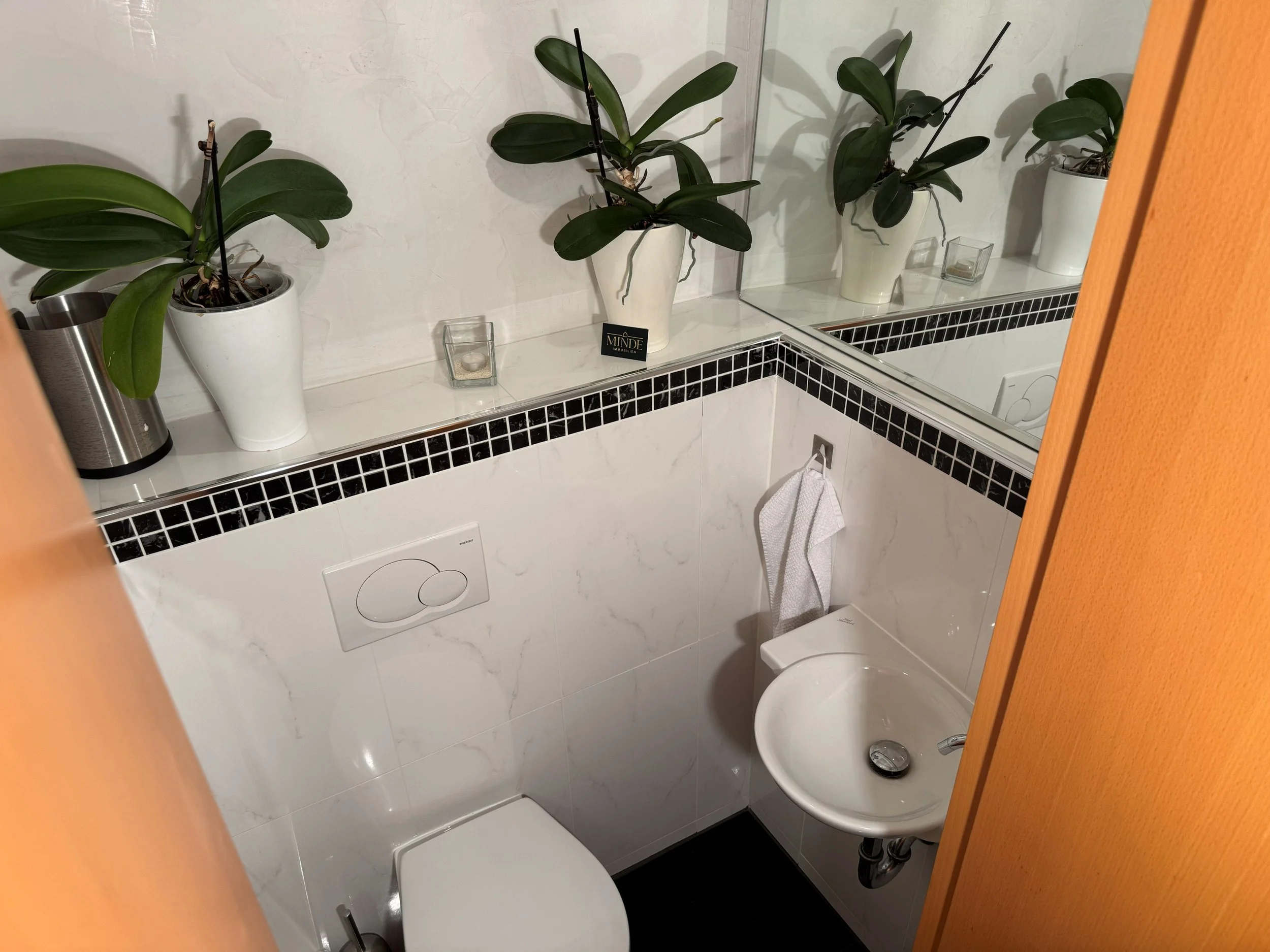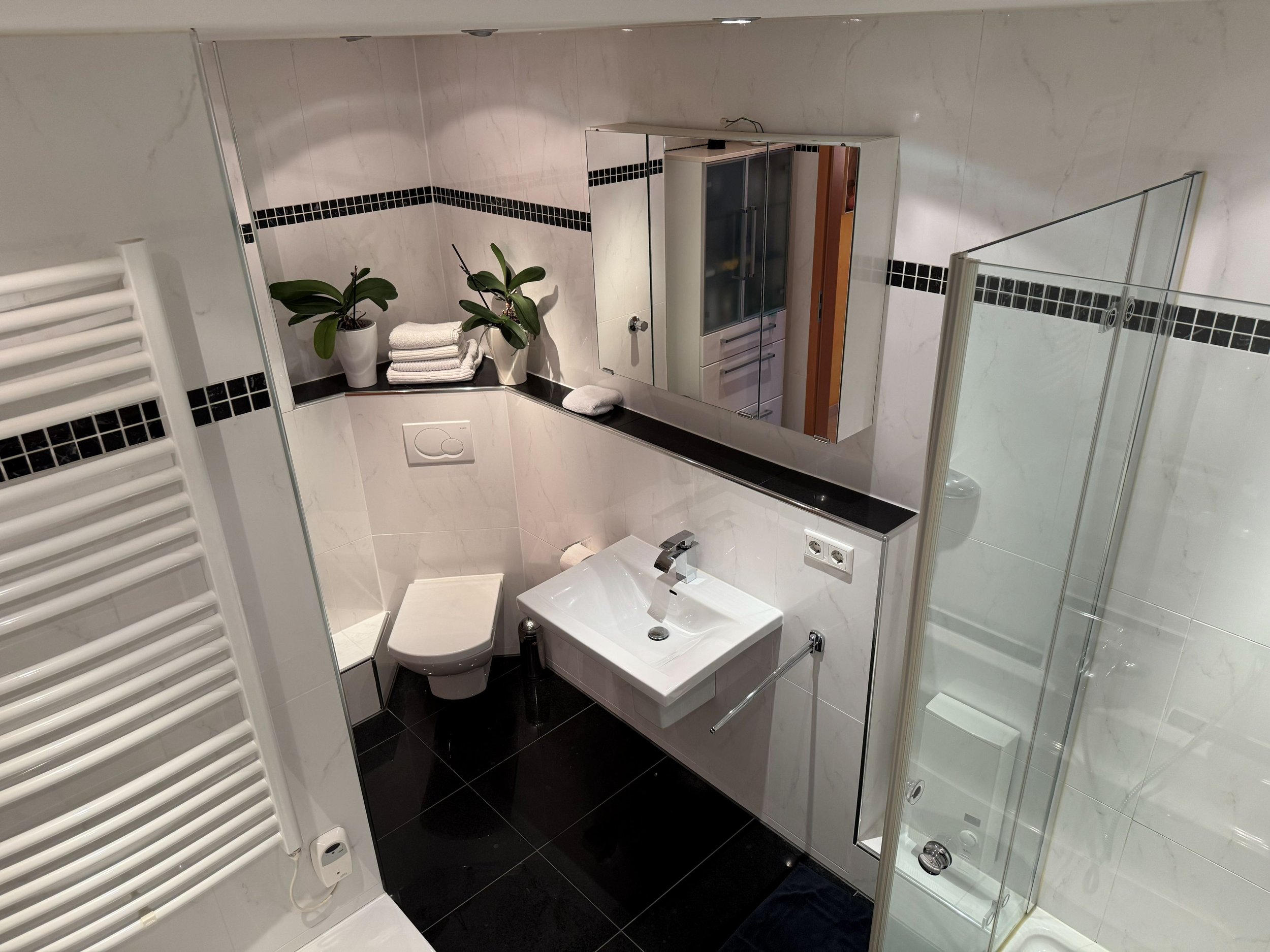 Auf dem sonnigen Nord-West-Balkon mit weitem Blick ins Grüne lässt man den Tag ausklingen – geschützt von elektrischen Markisen, mit einer Tasse Kaffee oder einem Glas Wein in der Hand. Das Badezimmer mit Badewanne und Dusche wird zur kleinen Wellness-Oase, ergänzt durch ein stilvolles Gäste-WC mit Granit und Marmor.